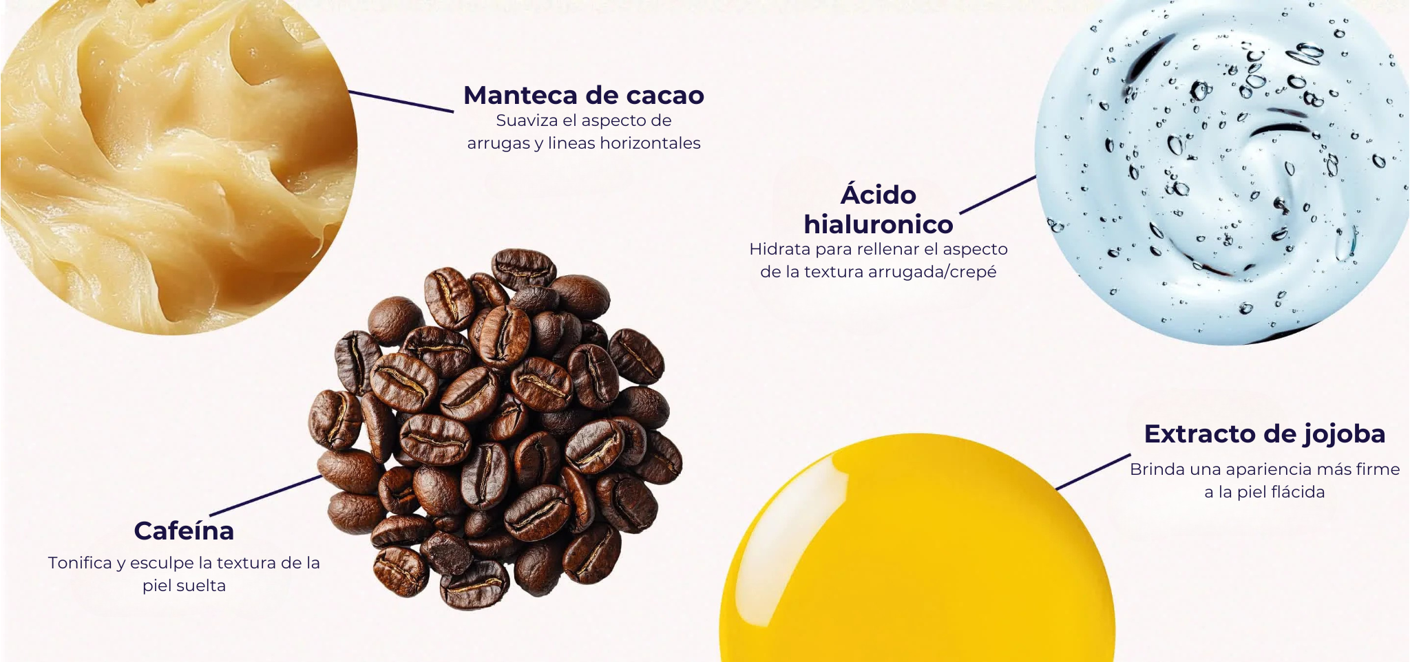 Su textura en gel-crema se absorbe rápido sin dejar sensación grasosa. Hidrata, suaviza y trabaja desde adentro para mejorar firmeza y elasticidad.